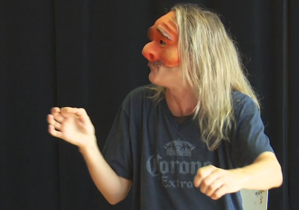 There the masks were more the false fronts the actors put on to others, whereas here, Ms. Rydvald uses them to inspire her improvisation of the underlying character.