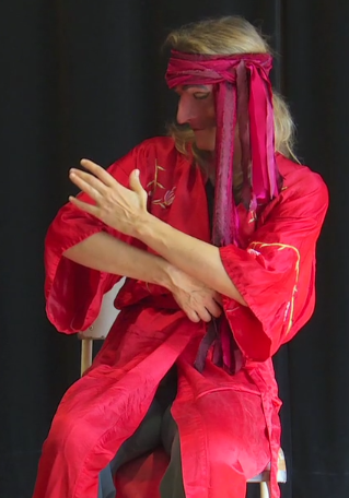 Besides creating many masks for her latest show, she has made full use of her mime and physical theatre body movement training (which she teaches at John Abbott) to depict an evangelical grandmother, a missing hippie mother (Magda), two daughters (Lina and Serai), a Hawaiian beach bum and an Indian guru.