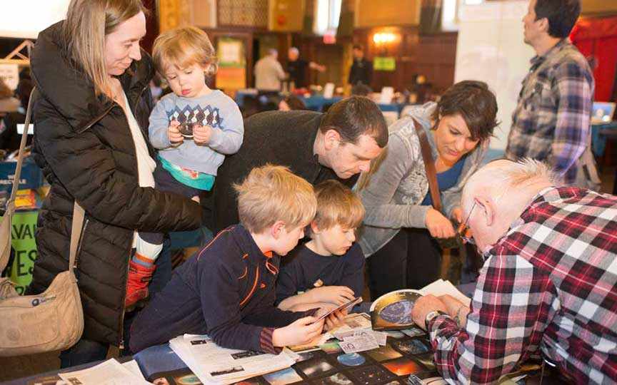 family at Westmount Earth HourIn Victoria Hall we typically entertain over 20 booths or display tables, all clearly identified, that relate to what EH stands for. This includes exhibits by Hydro Westmount (HW), the International Dark Sky Association/Quebec branch, the Royal Astronomical Society of Canada (RASC)/Montreal Centre, Friends of Summit Woods, Westmount Public Works, the Association of Pedestrians and Cyclists of Westmount (APCW), Environmental Options for the Home, and many more.