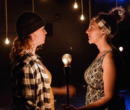Talisman, co-founded by Emma Tibaldo (Playwrights Workshop Montreal) and present artistic director Lyne Paquette in 2006, has established a firm place in the local independent theatre landscape. Ms Paquette here doubled as the set designer. The set in the 77-seat configuration was essentially bare, with many light bulbs hanging or standing on steps, lending a vaguely surreal quality to the whole.