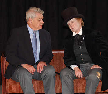 Director Chris Moore, who himself played the lead role in the 2013 full scale Persephone Production, here has added some cute directorial touches to the talented amateur cast. For instance, when The 15 Minute Hamlet (Bryan Ribero) recites “Words, words, words”, he is reading a copy of Hamlet For Dummies. When the usurping uncle Claudius (Malcolm McRae) banishes Hamlet abroad, it is to the oft mispronounced “Ingleland”. When Hamlet hurls his sword toward the King, it is transported twirling thru the air as in a Chinese action movie.