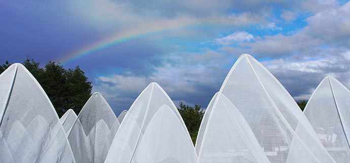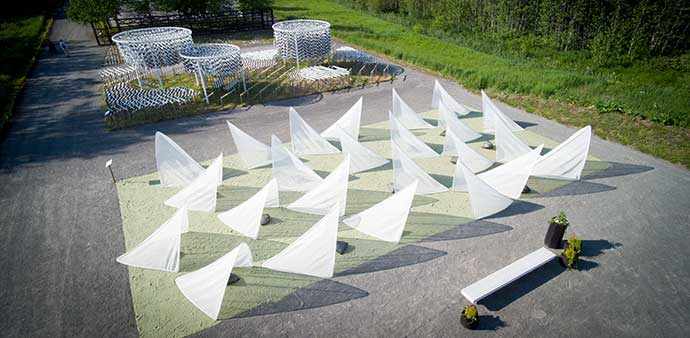 Chaque structure peut basculer entre deux orientations, en réponse à la position du soleil, et offre une alternance de points de vue qui modifient les sentiers à travers le site. Le jeu avec les structures évoque un banc de poissons ou une volée d’oiseaux se déplaçant dans des directions opposées, formant tout de même un tout. Les structures légères et la toile blanche rappellent un champ de fleurs, contrastant avec le paysage vert des environs et le bleu du ciel. TiiLT défie la notion de jardin par la création d’un environnement interactif, à la fois sculpture et paysage – pour évoquer le sens du lieu et la beauté d’éléments modestes. TiiLT offre des espaces simples, intimes, ombragés, pour se remémorer les longues journées de cette courte saison, le temps passé en solitaire ou entre voisins, embrassant le sentiment commun de décrocher tous ensemble.