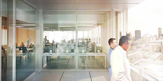 Tout au long du processus de conception, l’équipe a sans cesse cherché à repousser les limites et les standards de qualité, tant au niveau de l’utilisation du design paramétrique pour l’enveloppe du bâtiment, de l’emploi de l’impression 3D de maquettes de coordination, de l’approche innovatrice d’intégration du patrimoine bâti, que de l’utilisation soutenue de la technologie afin de faciliter la communication entre les différentes équipes impliquées sur le projet.