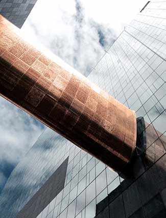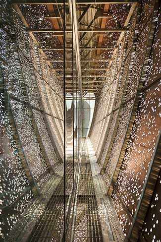 « Nous avons intégré les œuvres de façon à diluer la frontière entre l’art et l’architecture pour offrir aux visiteurs et aux employés une expérience plus humaine » confie Azad Chichmanian. « Par ailleurs, plusieurs éléments de l’architecture du CHUM peuvent être considérés en eux-mêmes comme des œuvres d’art. Le clocher reconstruit, la maison Garth et la salle de recueillement en sont de bons exemples, formant une série d’objets architecturaux qui animent la rue Saint-Denis. Mais c’est la passerelle qui surplombe la rue Sanguinet qui en est probablement le meilleur exemple : sur ce pont aérien, une arche de lumière émerge d’un jeu graduel de perforations dans la peau de cuivre qui l’enveloppe. »
