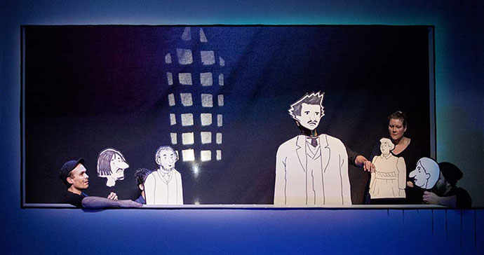 The cardboard principals are manipulated by five excellent actors in the manner of the black clad Japanese Bunraku but without the hoods so we can see who they are.