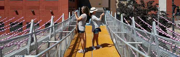Tels des équilibristes, les visiteurs flottent doucement 6 mètres au-dessus de la rue Ste-Catherine, sur une rivière multicolore de boules de plastique. Le plancher ajouré en caillebotis donne l’impression de se poser sur des fils tels des oiseaux. Certains visiteurs peuvent même y vivre « ’l’effet de pont suspendu »’ et tomber en amour! (Capilano Suspension Bridge experiment study, Donald Dutton and Arthur Aron, psychologists, 1974)