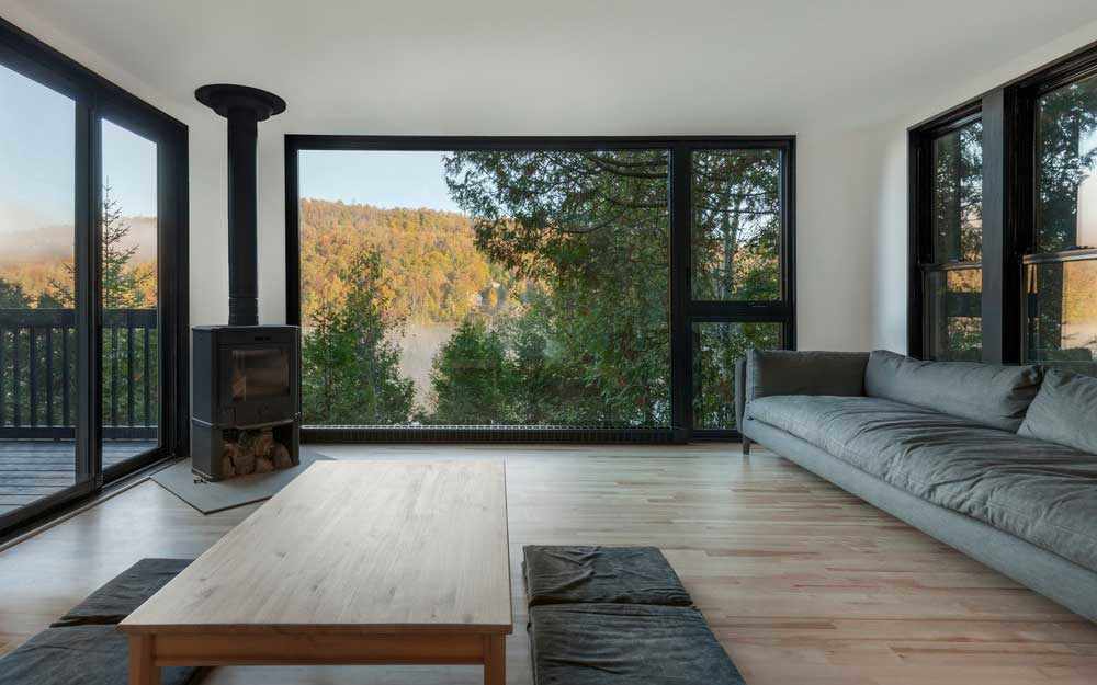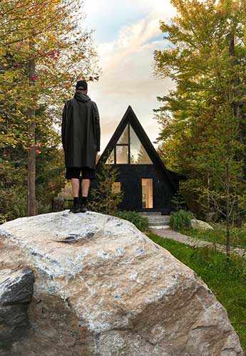 S’amusant ingénieusement avec les jeux d’échelle, Verville réussit à augmenter la perception de profondeur visuelle en exploitant les limites comme les ouvertures pour tirer admirablement parti de la densité de cet espace. Une fenêtre positionnée au sol de la chambre principale augmente la luminosité du coin cuisine situé en contrebas tout en offrant, depuis le lit, une vue sur le lac optimisant les perspectives sur la nature environnante. Permutant sa réflexion mathématique à l’extérieur, l’architecte redessine un ensemble volumétrique graphique unifié par le noir. Les soustractions appliquées aux quatre élévations percent de nouvelles ouvertures pointant tantôt le lac, tantôt le ciel, pour mieux raconter le paysage.