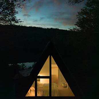Le chalet, construit dans les années 60 sur un site enchanteur des Laurentides, présente la forme caractéristique d’une construction à charpente en A. Une fois l’intérieur démoli et la structure entièrement dégagée, l’architecte exploite la forme structurale triangulaire rejetant la monotonie d’une organisation spatiale préétablie pour élaborer un nouvel agencement procurant un sentiment propice à la détente pour ce repaire familial à l’écart de la frénésie urbaine.