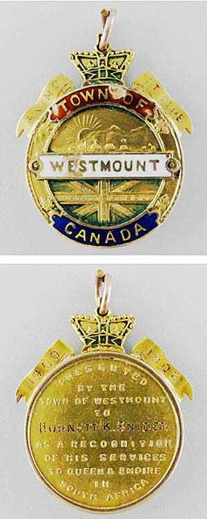A quick search found one for sale at eMedals that belonged to Burnett K. Snider. The reverse side reads: “Presented by the town of Westmount to Burnett K. Snider as a recognition of his services to Queen and Empire in South Africa”. (In case you are wondering, the price was listed at $1,950 USD).