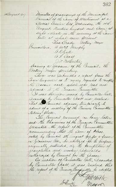 The first thing that strikes you is that, prior to 1908, council minutes were transcribed in beautiful longhand (today, almost a lost art) using a fountain pen – evidenced by the occasional ink spots created as the instrument was shaken to push more ink into the nib.