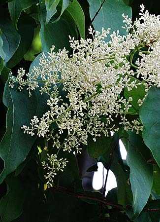 The genus name syringa is from the Greek “syrinx”, meaning “pipe” and describes the tree’s hollow stems. The species name reticulata is from Latin meaning “net-like” describing the vein pattern in the leaves.