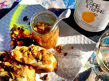 Crostini à la poire et au fromage bleu parsemés de graines de citrouille grillées