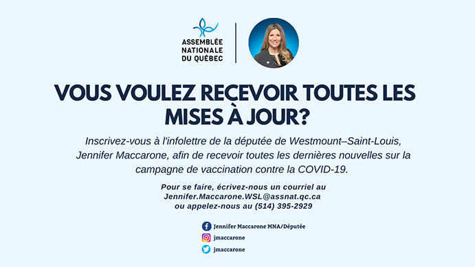 Le bureau de la députée de Westmount–Saint-Louis, Jennifer Maccarone, a mis sur pied dans les dernières semaines une infolettre pour vous informer des dernières nouvelles au sujet de la campagne de vaccination contre la COVID-19.