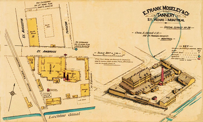 « La tannerie Moseley est construite aux abords du canal de Lachine, dans la rue Saint-Ambroise, en 1859. Il s’agit de la première installation industrielle sur le territoire de l’actuel quartier Saint-Henri. Aussi connue comme la « Moseley Shoe Leather Company », la tannerie se spécialise, comme son nom l’indique, dans la production de cuir verni pour les chaussures et les harnais. Alors que les anciennes tanneries sont davantage gérées par les membres d’une famille et axées sur la production artisanale du cuir, la nouvelle tannerie industrielle utilise, entre autres, la machine à vapeur et profite de l’essor manufacturier lié au canal de Lachine. En 1871, la compagnie, pour laquelle travaillent trente employés, est la plus importante tannerie de la ville. Moseley présente même ses produits à l’extérieur du pays, notamment à la Centennial International Exhibition de Philadelphie en 1876 et à l’Exposition universelle de Paris en 1878. »