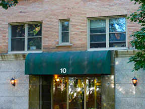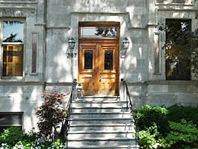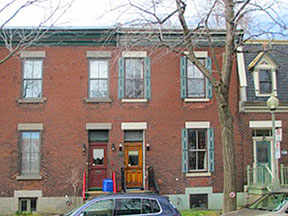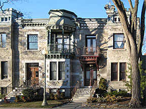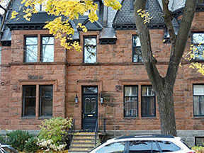 One of the doorways into the formerly named Academy Apartments. This building was built, in 1921, as a residential hotel. From: Montreal Gazette, February 12, 1921: “…built on the plan of the residential hotel and will contain fifty-two apartments… There will be a large ballroom on the ground floor and a cafeteria will be operated by the company on the same floor. Full hotel service will be furnished in addition to the usual apartment house services. The new building will be of four stories and basement. In size, it will be 185 by 115 feet, with outside courts. There will be four entrances.”