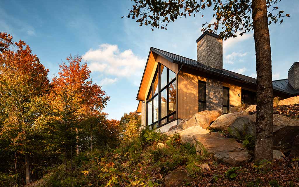 The natural stone fireplaces serve as warm focal points in the living spaces, reinforcing the connection with the wooded site. The raw and timeless stone mantels evoke the textures and colours of the surrounding landscape. They add character and robustness to the spaces while complementing the large glass openings and abundant natural light, creating harmony between the interior and exterior.